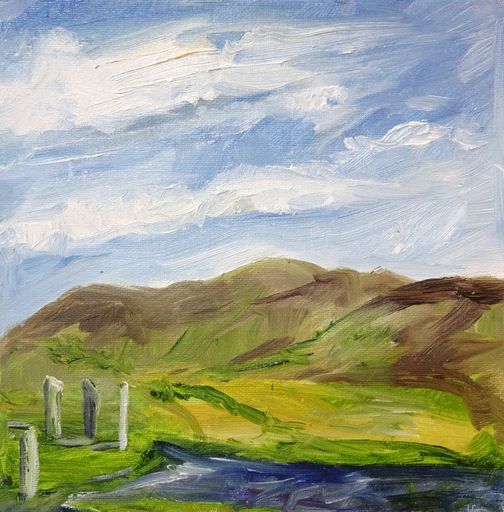 Using a variety of styles and media, I paint undulating land and colourful clouds and sky. These landscapes often include standing stones or trees. Colour is always important.