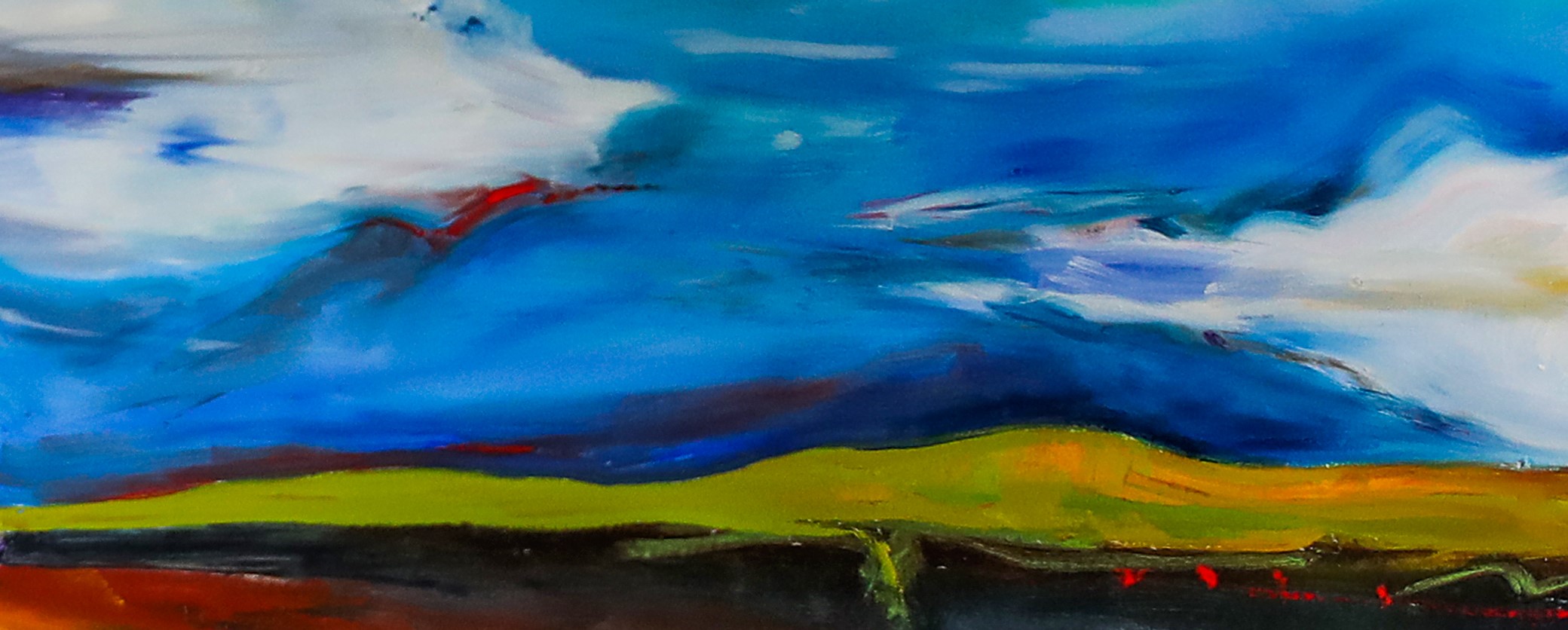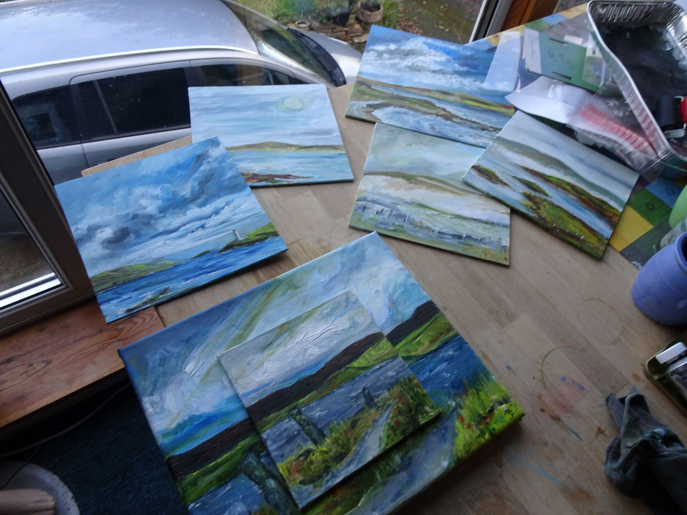 I may have been trained in New York but the paint brushes have moved the most in Scotland. Orkney is an inspiring place. Using watercolour, oil paint, and oil sticks, I paint its landscapes and sky on canvas, paper and lampshades in my Stromness studio/gallery. My oil paintings range from grandly large to small and intimate. Watercolours and prints are the average size.